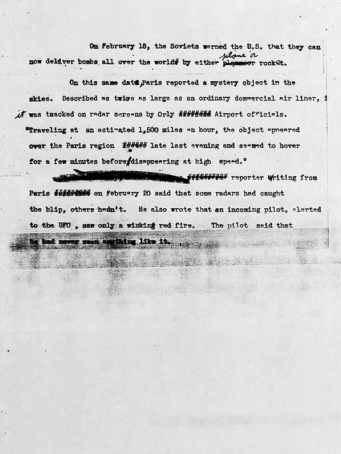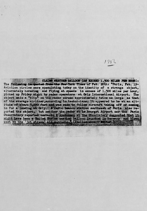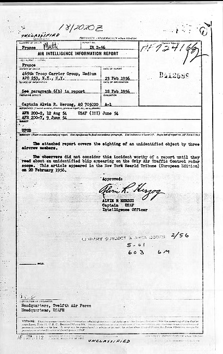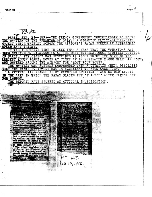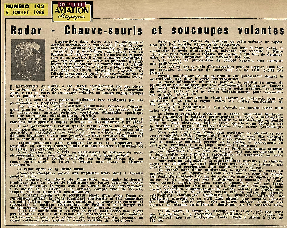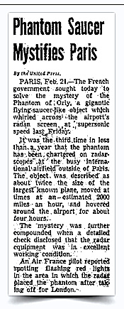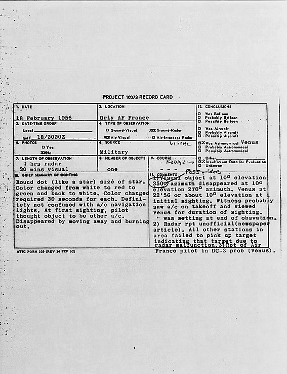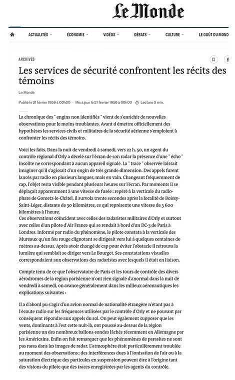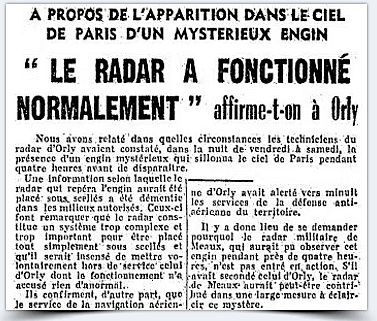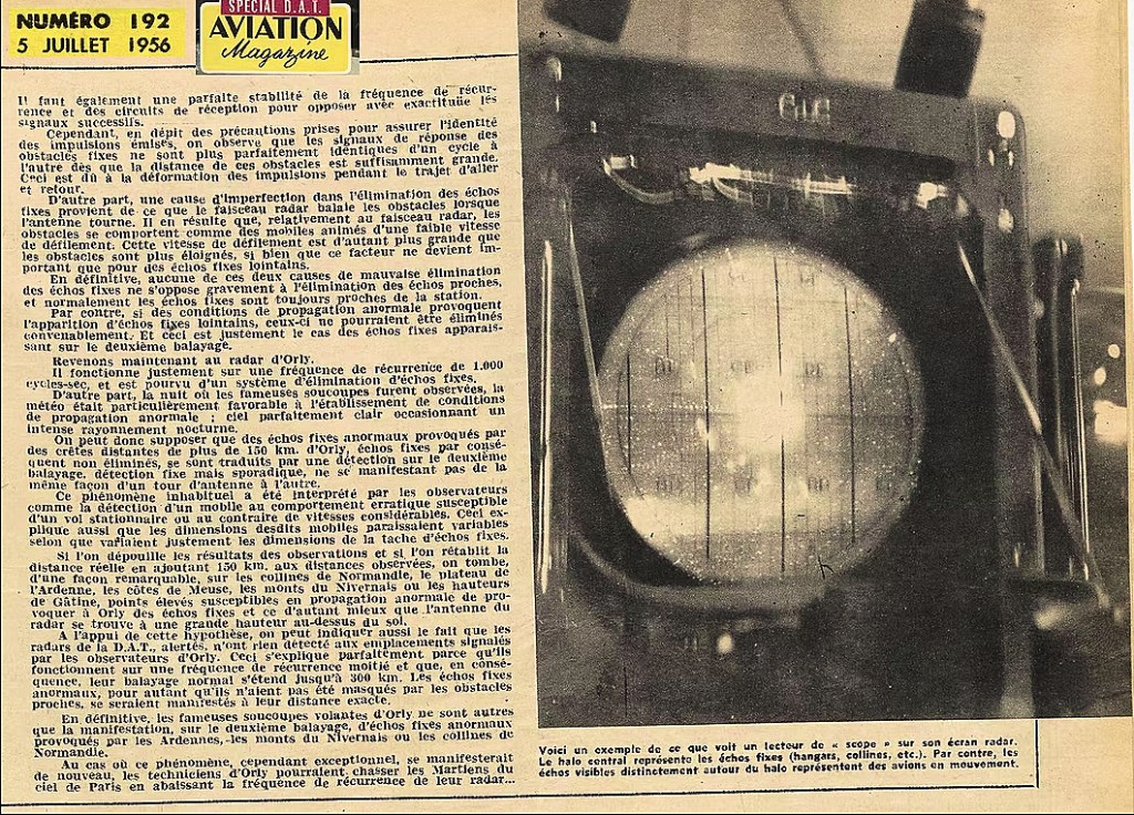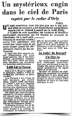 Dans la nuit du 17 au 18 février 1956 à 22:50 heures, apparaissait sur le radar de l’aéroport civil d’Orly près de Paris un écho correspondant à un objet d’une taille deux fois supérieure à celle des plus grands avions alors en service. Aucun avion n’étant supposé se trouver là à ce moment, les techniciens radar se bornèrent d’abord à suivre les évolutions de l’objet supposé, évolutions qui étaient totalement différentes de tout ce qu’ils avaient pu observer jusqu’ici.