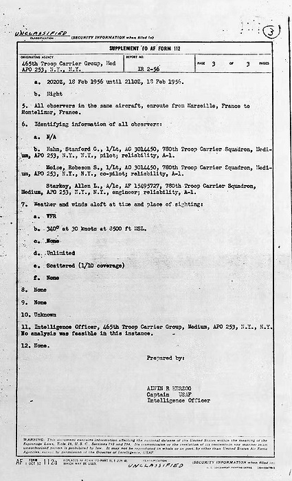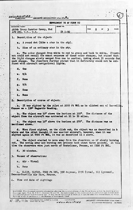 Le copilote, en se tournant vers ce côté, aperçoit de nouveau non seulement la mystérieuse lumière clignotante, mais bien l’objet lui-même, énorme et noir sur le fond du ciel. Lui et le Capitaine regardèrent l’OVNI pendant une demi-minute avant qu’il ne disparaisse. Dans son rapport, le Capitaine déclarait que l’objet qu’ils avaient vu ne portait aucune des lumières de navigation obligatoires.