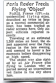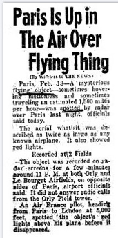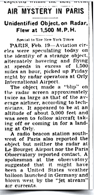 Paris, 18 fév. — Un mystérieux objet volant, parfois planant stationnaire et parfois se déplaçant à environ 1,500 miles par heure, a été repéré par radar au-dessus de Paris la nuit passée, ont dit les officiels aujourd’hui.