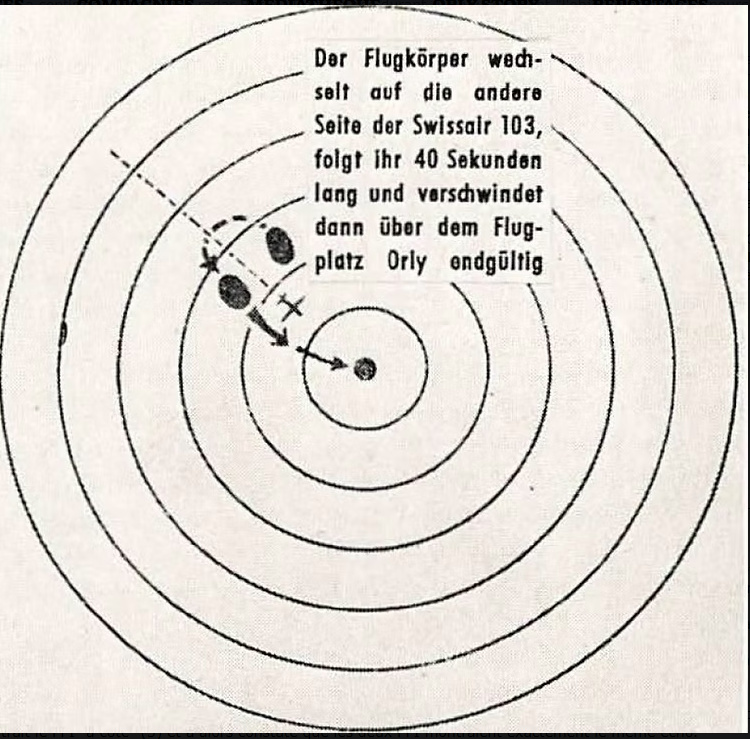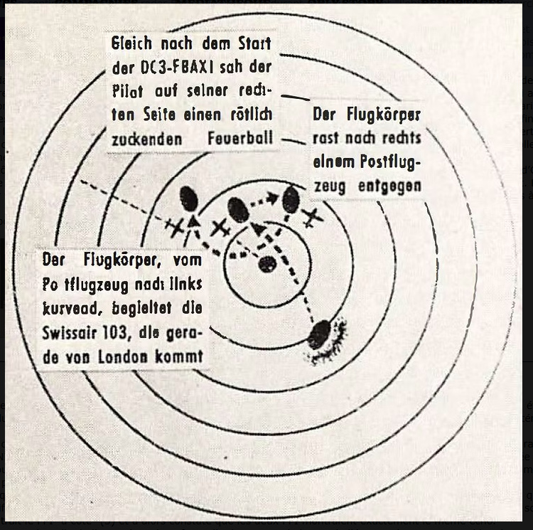 Par la suite, alors que l’objet était toujours détecté sur les radars, un Douglas Dakota DC-3 d’Air France (F-BAXI) transportant des passagers d’un vol régulier en provenance de Londres entre dans le champ du radar. L’objet inconnu, qui à ce moment était stationnaire, est vu sur l’écran radar accélérer à une vitesse foudroyante et foncer vers le DC-3.