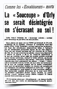 De leur côté, les techniciens de la tour de contrôle avaient fait la même constatation, ainsi que les gendarmes mobiles en mission de surveillance sur l’aéroport, ces derniers indiquant en outre que « l’engin » en se désintégrant, avait éclaté en trois morceaux distincts. Des recherches aussitôt effectuées de la zone nord d’Orly ne devaient cependant donner aucun résultat. La police affirme n’avoir retrouvé aucun débris suspect ni relevé aucune trace anormale sur le sol.