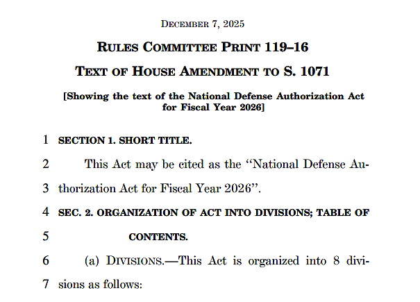 La loi de finances de la défense nationale pour l’exercice 2026 (NDAA), qui autorise 900,6 milliards de dollars de dépenses de défense, a été adoptée par la Chambre des représentants le 10 décembre par 312 voix contre 112. Les responsables des commissions des forces armées de la Chambre et du Sénat ont publié le texte de compromis le 7 décembre, et son adoption par le Sénat est prévue la semaine du 15 décembre.