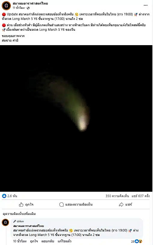 De nombreux internautes de diverses régions ont commenté la publication de la Société astronomique de Thaïlande, que ce soit à Suphan Buri, Si Saket, Chaiyaphum, Nakhon Sawan, Lop Buri, Phrae ou Khon Kaen. Ils ont également aperçu cette étrange lumière et ont voulu savoir de quoi il s’agissait réellement. Certains ont pensé à une comète, à la lumière d’un avion ou à une étoile, mais finalement, lorsqu’ils ont vu l’annonce de la société, ils ont réalisé que ce n’était pas le cas.