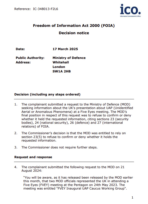 1. Le plaignant a présenté une demande au ministère de la Défense (MOD) pour obtenir des informations sur la présentation faite par le Royaume-Uni sur les UAP (phénomènes aériens ou anormaux non identifiés) lors d’une réunion du Groupe des cinq. La position finale du ministère de la Défense à l’égard de cette demande a été de refuser de confirmer ou d’infirmer s’il détenait les informations demandées, citant les articles 23 (organes de sécurité), 24 (sécurité nationale), 26 (défense) et 27 (relations internationales) de la FOIA.