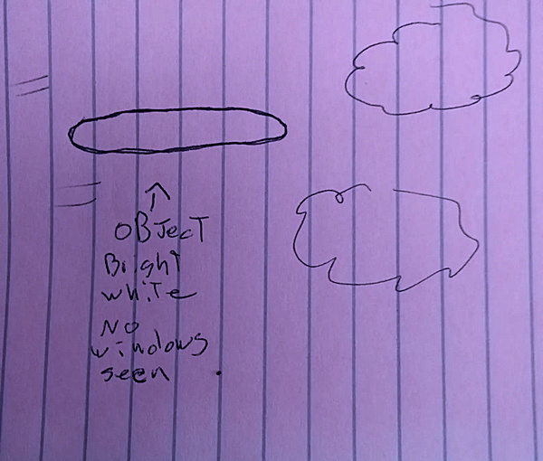 Un dessin d’un engin blanc de forme cylindrique signalé près de Port Huron le 28 juin 2025, qui a été fourni au NUFORC.