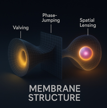 NRGscapes LAB : Visualisation conceptuelle de la dynamique de la structure membranaire dans l’artisanat de terrain, illustrant la valvence, le saut de phase et la lentille spatiale en tant que mécanismes de transition trans-médiale et de mobilité indexée scalaire. 04