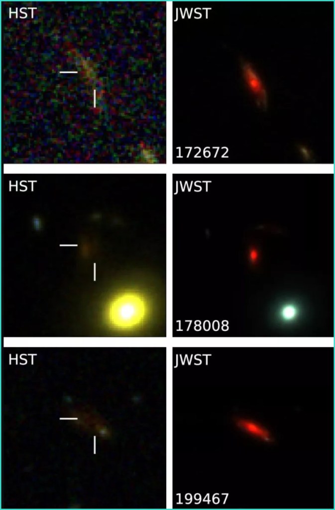 Photo : Galaxies OVNI vues par Hubble (à gauche) et Webb (à droite). Dans leur étude, les chercheurs ont analysé 56 galaxies OVNI issues de l’étude JADES de Webb. The Astrophysical Journal