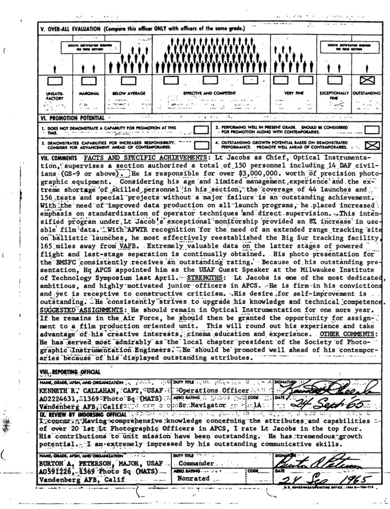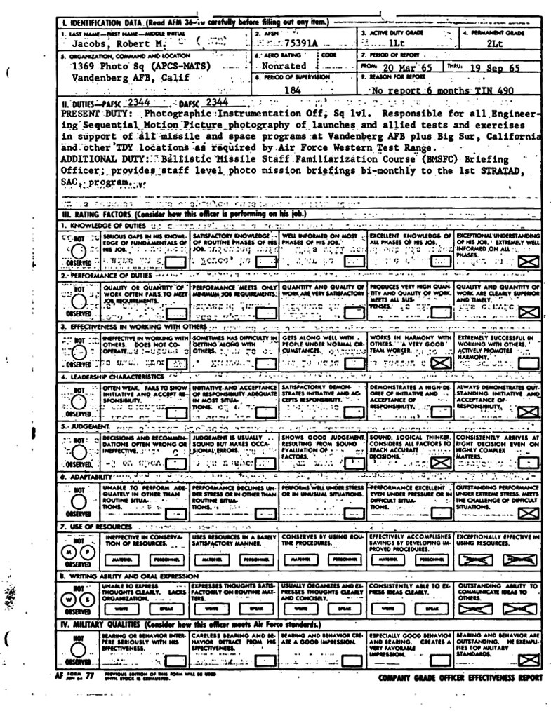 Avant cela, j’étais, entre autres, le lieutenant Robert M. Jacobs, responsable de la section d’instrumentation photo-optique du 1369e escadron photographique de la base aérienne de Vandenberg. Ma section, composée de 135 sous-officiers et aviateurs, assurait la couverture vidéo haute vitesse de chaque ICBM lancé depuis le polygone d’essai occidental grâce à une trentaine de caméras situées sur et autour de la rampe de lancement, ainsi qu’à quatre à six caméras haute vitesse à longue focale montées sur des trackers, réparties sur trois emplacements différents de la rampe.
