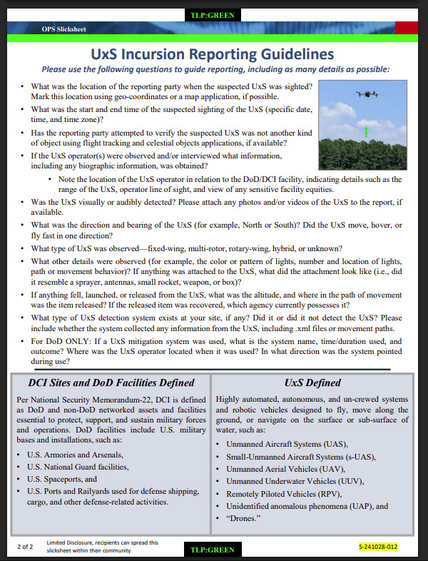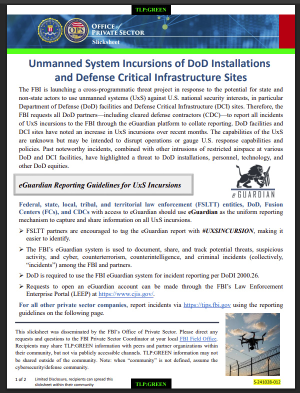 Le ministère de la Défense (@DeptofWar) demande à tous ses sites d’infrastructures critiques et installations de signaler au FBI toute incursion d’agents non-résidents (UxS). Il reconnaît que ces incursions peuvent viser à perturber les opérations ou à évaluer les capacités et politiques de réponse des États-Unis. Il souligne expressément qu’il s’agit d’une menace pour les installations, le personnel et les technologies du ministère de la Défense.