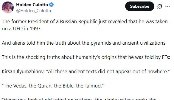 L’ancien président d’une République russe vient de révéler qu’il a été emmené à bord d’un OVNI en 1997. Et les extraterrestres lui ont dit la vérité sur les pyramides et les civilisations anciennes.