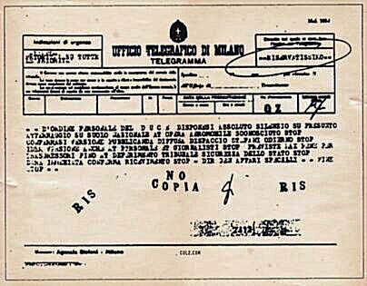 Photo : Télégramme de Mussolini en juin 1933, ordonnant un silence complet sur « l’atterrissage présumé d’un avion inconnu sur le sol national ».