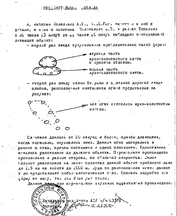 Moi, le capitaine Kovalenko A. V., ma femme, mes enfants et la famille du capitaine Polykhaev étaient dans la région du village de Topyilnja de 20h15 à 21h10 et observèrent un objet volant inconnu – le premier avait la forme d’un triangle 1 comme dans le dessin : la partie supérieure était dorée brillante avec un rouge rougeâtre, la partie inférieure était dorée brillante – le second objet observé entre V. Ozeryany et La gare ferroviaire était dans une ellipse dont les lumières étaient atténuées, comme montré dans le dessin, toutes les lumières brillaient d’un doré éclatant.
