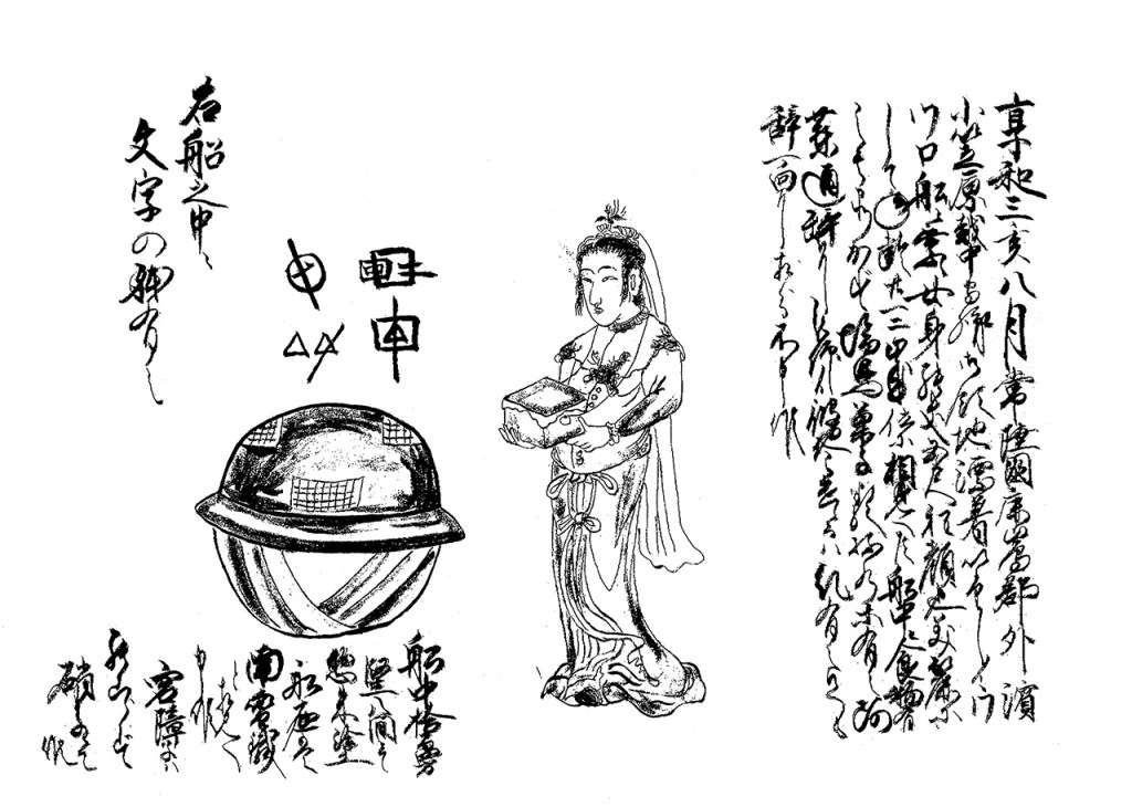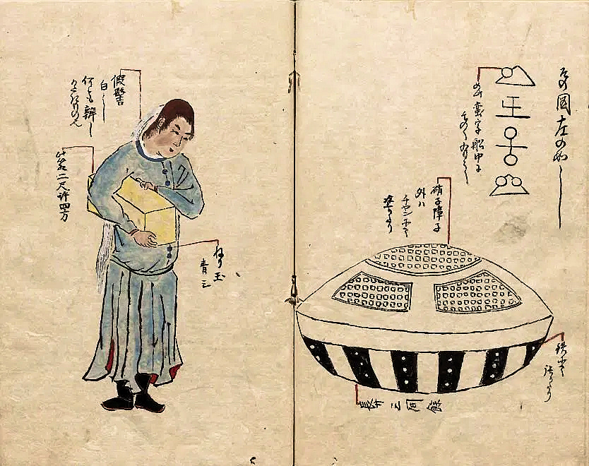 Au début de l’année 1803, un vaisseau extraterrestre s’échoua sur les côtes japonaises. Des pêcheurs, le prenant pour l’un des leurs, ramèrent pour remorquer cet objet flottant sur les vagues. Il n’en était rien. Le navire ressemblait à un chaudron, une marmite à riz ou une capsule ; son fond était forgé dans une sorte de métal lourd ; le dessus semblait être en palissandre, laqué et incrusté de verre ajouré. Sur la plage, les villageois s’émerveillèrent de cette ingénierie avancée et, regardant à travers les hublots opaques, ils aperçurent quelque chose qui se tortillait. Soudain, un panneau s’ouvrit brusquement sur la coque et un être d’apparence presque humaine en sortit… Du moins, c’est ce que rapportent les différentes sources, avec plus ou moins de contradictions.