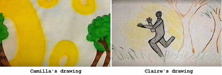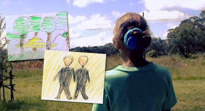 Le lendemain, Hind interroge six élèves de 7e année, puis deux jeunes filles, sous le regard attentif des autres enfants. Elle discute des dessins* avec Mackie devant eux et lui demande s’il croit aux visites extraterrestres sur Terre. Aucun des témoignages des enfants ne donne de détails précis sur l’apparence de l’objet, pourtant de nombreux dessins montrent des fenêtres et des hublots, des portes, des jambes d’atterrissage, des antennes, des lumières clignotantes, etc. Aucun ne décrit les caractéristiques de l’« extraterrestre », hormis de grands yeux et un costume noir. Certains dessins représentent d’autres traits du visage, une ceinture, des boutons, un costume à pois, des doigts et des orteils, des têtes et des yeux de taille normale, ou encore l’absence d’yeux. Personne n’a dessiné le bandeau qui figurait dans le tout premier témoignage fait à la femme de la cantine.