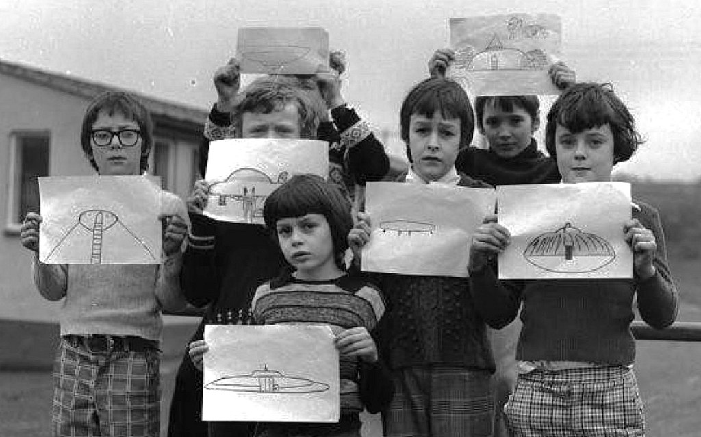 Mme Kirkman m’a raconté que lorsque les enfants sont arrivés en courant à la cantine, parlant avec excitation d’« un petit homme courant avec un bandeau autour de la tête et une combinaison », elle était totalement sceptique. Peut-être, a-t-elle dit, essayaient-ils de la faire sortir de la cantine où il y avait des bonbons, des gâteaux et, bien sûr, l’argent de la cantine. Elle a refusé de quitter le magasin. Sa fille, Fifi, âgée de 10 ans, lui a raconté plus tard qu’ils avaient vu un petit objet blanchâtre atterrir à une centaine de mètres de là où elle se trouvait. Il brillait. Puis il s’est rapproché et a pris une sorte de couleur dorée. Certains enfants étaient hystériques.