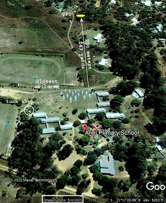 Le vendredi 16 septembre, vers 10h15, soixante-deux enfants de l’école Ariel, une école primaire privée de Ruwa (à environ 20 km d’Harare), profitaient de la récréation de la matinée sur leur terrain de jeux. Soudain, ils ont aperçu trois boules argentées dans le ciel au-dessus de l’école. Celles-ci ont disparu dans un éclair, puis sont réapparues ailleurs. Ce phénomène s’est produit à trois reprises, puis les boules ont commencé à descendre vers l’école. L’une d’elles s’est posée (ou a plané) au-dessus d’une zone de terrain accidenté composée d’arbres, de buissons épineux et d’herbe coupée gris-brun d’où jaillissaient des pousses de bambou. Les enfants n’ont pas le droit d’aller dans cette zone, pourtant adjacente à leur terrain de jeux et non clôturée, à cause des serpents, des araignées et peut-être d’autres animaux dangereux. On peut rapidement disparaître de la vue en marchant ici, et il n’y a qu’une seule piste très accidentée, utilisée par les tracteurs pour tenter de débroussailler la zone.