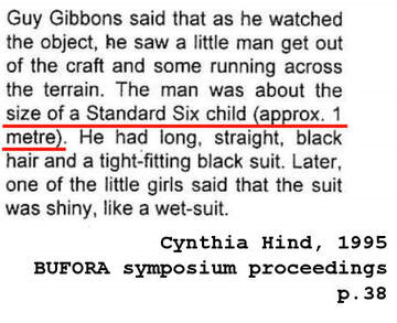 J’ai pu interviewer une dizaine d’élèves plus âgés, et ces entretiens ont été enregistrés pour la BBC. Les témoignages étaient similaires, même si certains enfants étaient plus observateurs que d’autres. De l’avis général, un objet est tombé dans la zone indiquée, à une centaine de mètres de l’endroit où ils se trouvaient, en bordure du terrain de sport de l’école. Un petit homme (environ un mètre de haut) est alors apparu au sommet de l’objet. Il a parcouru quelques mètres sur le terrain accidenté, a aperçu les enfants et a disparu. Lui, ou quelqu’un qui lui ressemblait beaucoup, est ensuite réapparu près de l’objet. Celui-ci a décollé très rapidement et a disparu. Le petit homme portait un costume noir moulant, « brillant » selon une jeune fille de 11 ans qui l’a observé. Il avait un long cou maigre et d’énormes yeux ronds comme des ballons de rugby. Son visage était pâle et ses longs cheveux noirs lui descendaient jusqu’aux épaules.