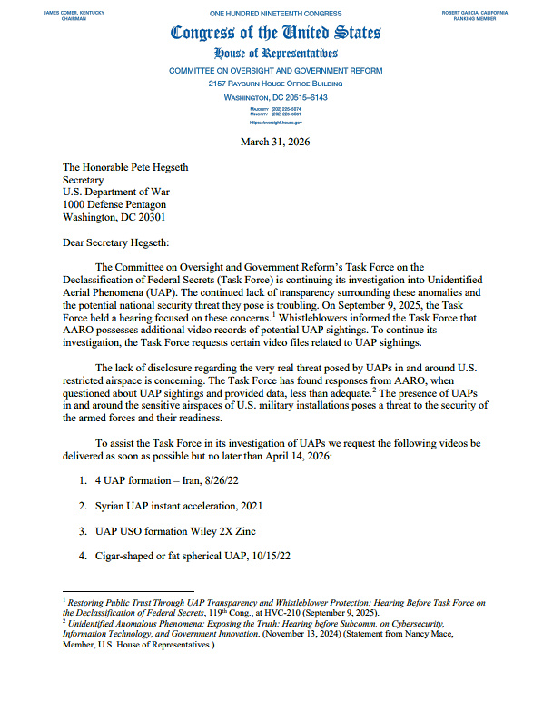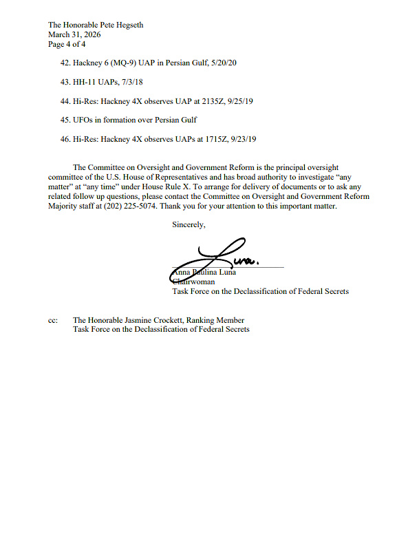 Le 31 mars 2026, la députée Anna Paulina Luna (R-Fla.) a envoyé une lettre au secrétaire à la Guerre Pete Hegseth qui était sans précédent dans l’histoire du Congrès concernant les OVNIs.