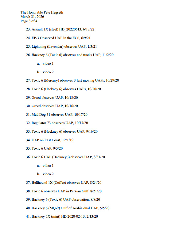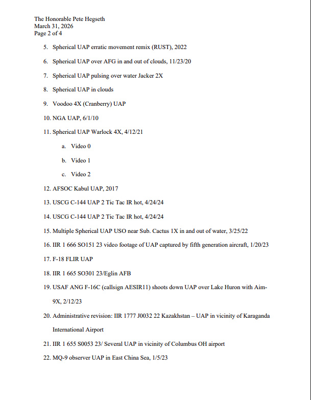 L’AARO maintient une page d’images publiques avec quelques clips déclassifiés. Le groupe de travail demande maintenant 46 de plus. L’écart entre ce que l’AARO a publié et ce qu’il est censé détenir est le point central de la demande de Luna.