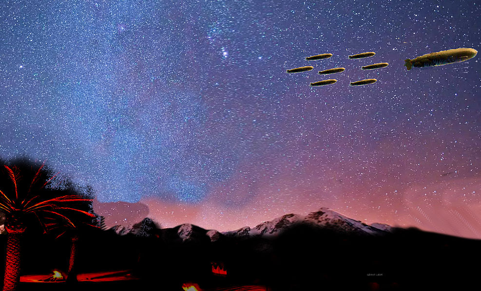 Illustration dans un contexte imaginaire de l’observation d’OVNI Zeppelin faite à Casablanca en 1929-1930.